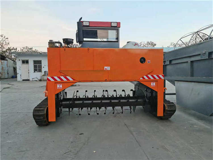 履帶式翻拋機采取履帶式行走設計,可前進、倒退、轉彎,由一人操控駕駛。行駛中整車騎跨予先堆置長條形肥機上,由機器下掛裝的旋轉刀 ,對肥機原料實施翻拌、蓬松、移堆,車過之后形成新的條形堆垛,即可在開闊場地
